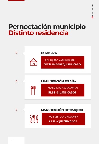 Gestores Alpe Pernoctación municipio Distinto residencia ESTANCIAS NO SUJETO A GRAVAMEN TOTAL IMPORTE JUSTIFICADO MANUTENCIÓN ESPAÑA NO SUJETO A GRAVAMEN 53,34.-€ JUSTIFICADOS MANUTENCIÓN EXTRANJERO NO SUJETO A GRAVAMEN 91,35.-€ JUSTIFICADOS 8